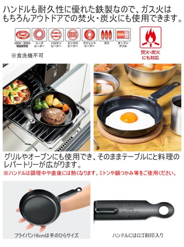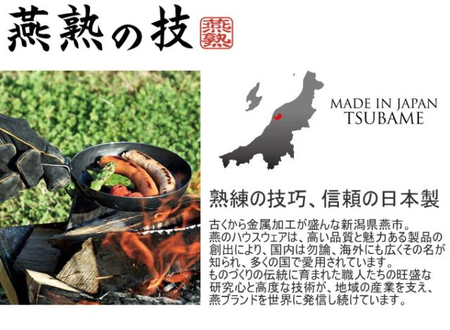 金属加工の街、新潟県燕市で作られた信頼の日本製。 ハンドルも耐久性に優れた鉄製なので、ガス火はもちろんアウトドアでの焚火・炭火にも使用できます。 グリルやオーブンにも使用でき、そのままテーブルにと料理のレパートリーが広がります。 ※ハンドルは調理中や直後には熱くなります。ミトンや鍋つかみ等をご使用ください。 ※食洗機不可。 |