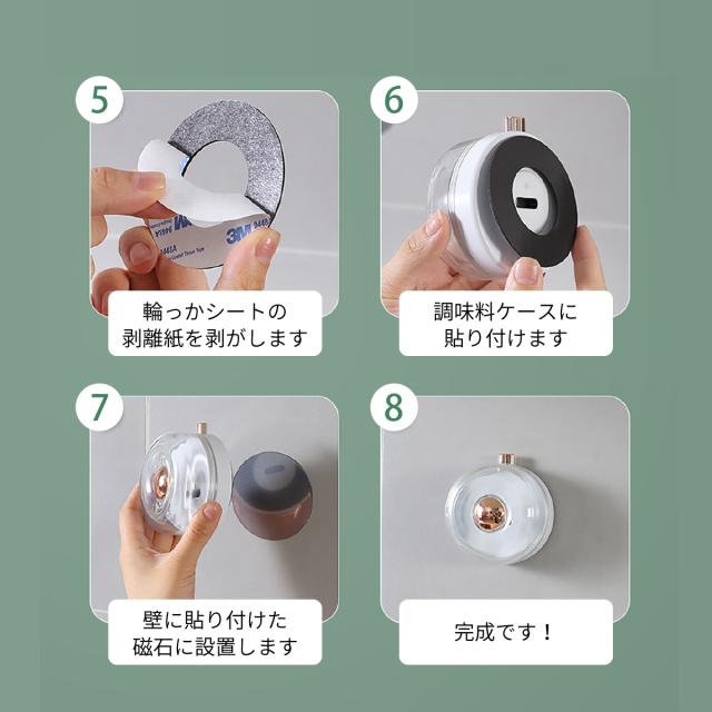 【マグネットシートで色んな場所に設置】調味料ケースと設置部分に取り付けられるマグネットシートが付属。磁石がくっつかない場所にも対応しています。