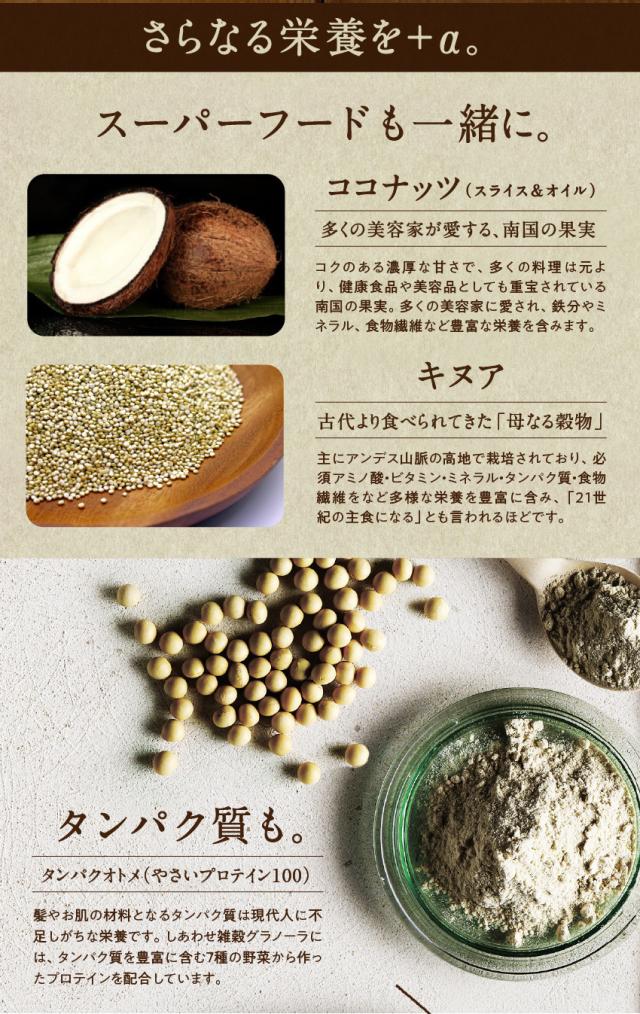 さらにココナッツ、キヌア、植物由来100%のプロテインまで詰め込み栄養をプラス。