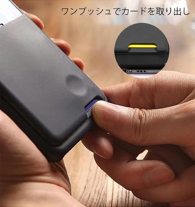 液体製のカードポケット付きまして、手触りが良くて、右下に押しやすい穴が空いているために、カードの取りが易いです。カードだけではなく名刺やお札なども収納することが出来ます。