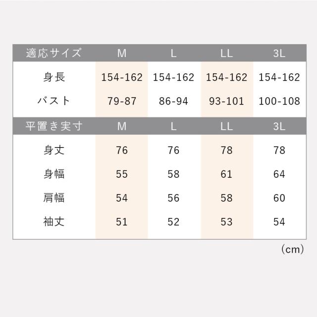 ■サイズ:身長154-162、M/バスト79-87、身丈76、身幅55、肩幅54、袖丈51、L/バスト86-94、身丈76、身幅58、肩幅56、袖丈52、LL/バスト93-101、身丈78、身幅61、肩幅58、袖丈53、3L/バスト100-108、身丈78、身幅64、肩幅60、袖丈54cm