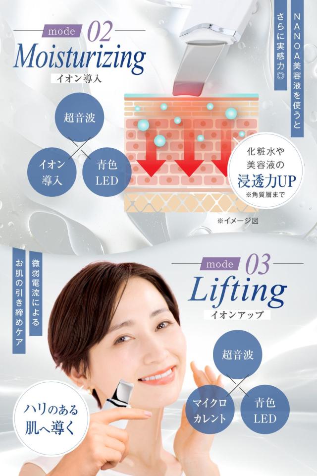 ◆ モード1:Cleansingピーリング、モード2:Moisturinzingイオン導入、モード3:Liftingイオンアップの3つのモードがあり、ウォーターピーリング以外にも肌の保湿やハリを与える機能があります。