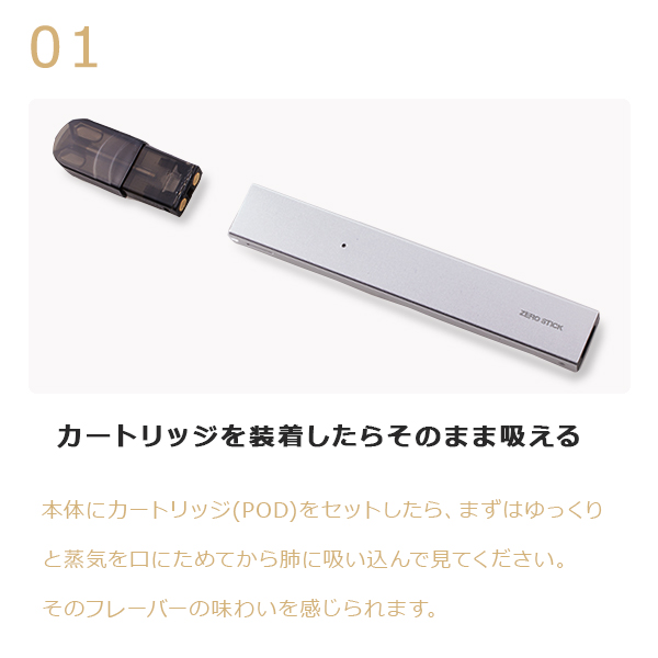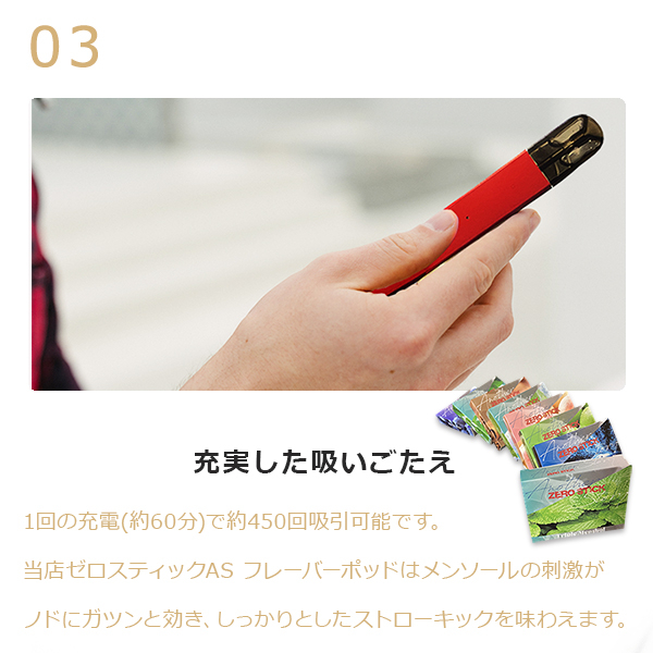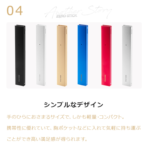 | 商品説明 | 【ゼロスティックからスタイリッシュを追求したPOD型VAPEが新登場!】 こちらの商品は選べる2本SETの販売ページとなります。 タバコを吸う人吸わない人でも多彩な味わいと香りを楽しめる ゼロスティックAS お好みのフレーバーでリラックスしてみませんか? 初めての方でも買ってすぐに楽しめるデバイスとなります。 本体にカートリッジ(POD)をセットして吸い込むだけ! 内部の清掃やコイルの交換など面倒な手間は一切なし。 アナザーストーリーと銘打たれたこのデバイスで多彩なフレーバーを楽しんで欲 しい。 【ゼロスティックASはこんな方におすすめ】 ・場所を気にせず手軽にリフレッシュしたい。 ・禁煙を初めてから口が寂しい時。 ・気軽に吸いたい、気分転換や口寂しいとき。(部屋や車内etc) ・このデバイスで多彩なフレーバーとの出会いが欲しい方。 ・タバコの本数を減らしたい方。 ・加熱式電子タバコのような面倒なメンテナンスをしたくない方。 【カートリッジを装着したらそのまま吸える】 本体にカートリッジ(POD)をセットしたら、まずはゆっくりと蒸気を口にためて から肺に吸い込んで見てください。そのフレーバーの味わいを感じられます。 【メンテナンス不要】 内部の清掃やコイルの交換など面倒な手間はなし カートリッジの中身が無くなれば外して新しいものに交換してもらえればOK 【充実した吸いごたえ】 1回の充電(約60分)で約450回吸引可能です。 当店ゼロスティックAS フレーバーポッドはメンソールの刺激が ノドにガツンと効き、しっかりとしたストローキックを味わえます。 【シンプルなデザイン 全6カラー】 手のひらにおさまるサイズで、しかも軽量・コンパクト。 携帯性に優れていて、胸ポケットなどに入れて気軽に持ち運ぶことができ高い 満感が得られます。 カラーは全6色 ・ブラック ・ホワイト ・ゴールド ・ブルー ・レッド ・シルバー 【商品詳細】 【本体サイズ】:約 H93.3 x W15.1 x D7.3 mm 【重量】:約 13g 【パッケージサイズ】:約 H6.2 x W11.5 x D1.8 cm 【USBコード長さ(Type-C)】:約 32cm 【バッテリー容量】:リチウム電池 230mAh 【出力電圧】:≦3.5v 【出力パワー】:7W 【充電時間】:約 60分 【吸引可能数】:約 450回吸引可能(フル充電時) ※吸引回数は吸う強弱によって個人差があります 【原産地】中国 【使用上の注意】 ・20歳未満の未成年者への販売はいたしません。 ・駅や空港、病院などの公共機関や喫煙が禁止されている場所、他人に迷惑をか ける場所での吸収はしないでください。 ・喘息等の持病がある方、妊娠中または授乳中の方は使用しないでください。薬 を服用されている方や持病のある方は医師にご相談の上、ご使用ください。 ・万が一、身体に異常を感じた場合は、直ちにご使用をやめ、医師の診断を受け てください。 ・急な吸収や過度な吸収、連続した吸収等は故障の原因となります。 ・強い衝撃や圧力を加えないでください。 ・水に濡らしたり湿気の多い場所、火気のそばで使用しないでください。感電や ケガ、故障の原因となります。 ・小さなお子様の手の届く場所、直射日光や高温多湿の場所、炎天下の車内等に 保管しないでください。液漏れや破裂等、性能低下や故障の原因となります。 ・分解、修理等は絶対にしないでください。 ・本体の処分につきましてはリチウム電池を内蔵しておりますので、各地方自治 体の廃棄処分に従ってください |