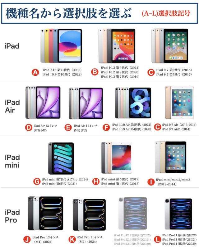 | サイズ | ・iPad Air 11インチ(M2)(2024) ・iPad Air 13インチ(M2)(2024)※iPad Pro12.9インチと兼用ケースとなります。カメラカットアウトはスクエアタイプとなります。 ・iPad Pro 11インチ(M4)(2024) ・iPad Pro 13インチ(M4)(2024) ・iPad 10.9インチ 第10世代 ・iPad 10.9インチ 第10世代 ・iPad 10.2インチ 第9世代/第8世代/第7世代 ・iPad 9.7インチ 第6世代/第5世代 ・iPad Air 11インチ (M2)(2024) ・iPad 10.9インチ Air5 ・iPad 10.9インチ Air4 ・iPad 10.5インチ Air3 ・iPad Air2 ・iPad Air ・iPad mini ・iPad mini2 ・iPad mini3 ・iPad mini4 ・iPad mini5 ・iPad mini 7(A17 Pro) ・iPad mini6 ・iPad Pro11インチ(2022/2021/2020) ※サイズが多種ございます。 『iPad識別画像』をご確認くださいませ。 |