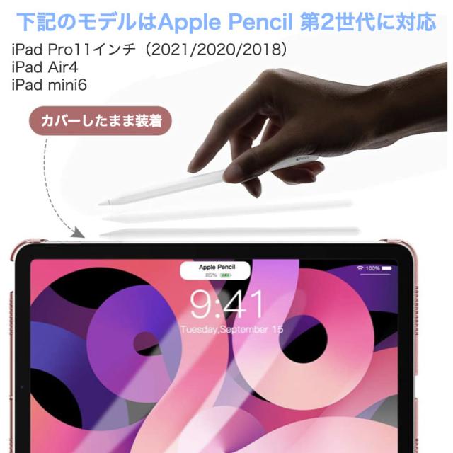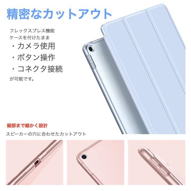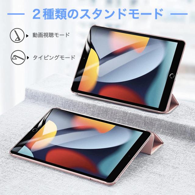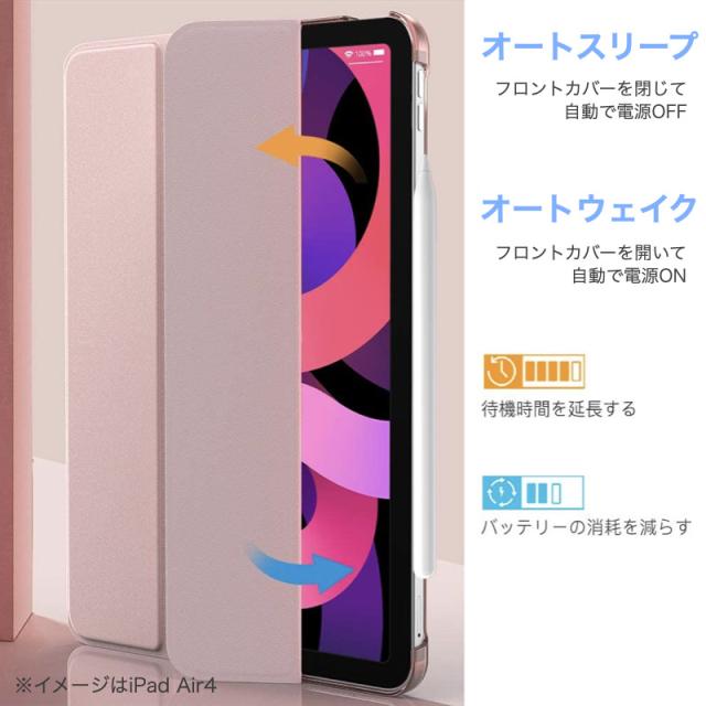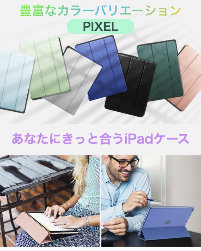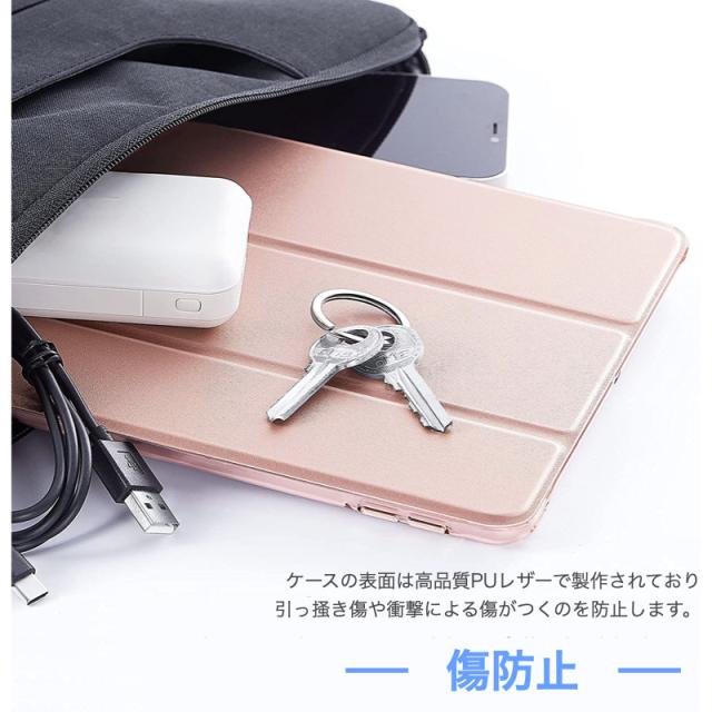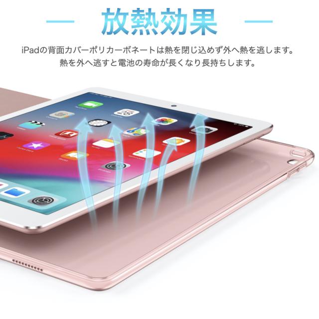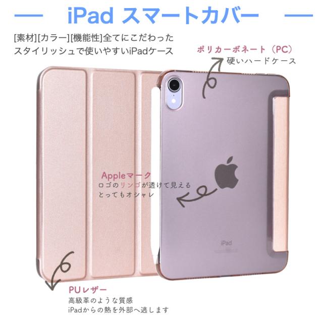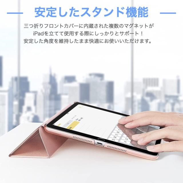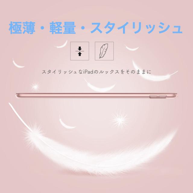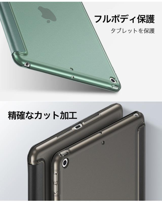 【三つ折りフロントカバー】風呂ふた仕様の三つ折りのフロントカバーは、高品質なPUレザー素材で仕上げられており、この価格では想像できないおしゃれで高級感のあるケースになっています。三つ折りフロントカバーには、複数のマグネットが均等に内蔵されています。【安定したスタンド機能】フロントカバーに内蔵された複数のマグネットにより、安定したスタンド機能をご利用いただけます。タイピングや動画視聴などiPadを立ててご使用の際に、とても便利にご利用いただけます。【半透明バックケース】 バックケースは、三つ折りフロントカバーと同じ色合いの半透明色で、Appleのロゴマークのリンゴがうっすらと透けて見えます。半透明のバックケースには強度のあるポリカーボネート素材を使用しており、傷や指紋が付きにくい特別な処理が施されています。【オートスリープ機能】オートスリープ機能で、バッテリーが無駄に消費してしまうのを防ぎます。