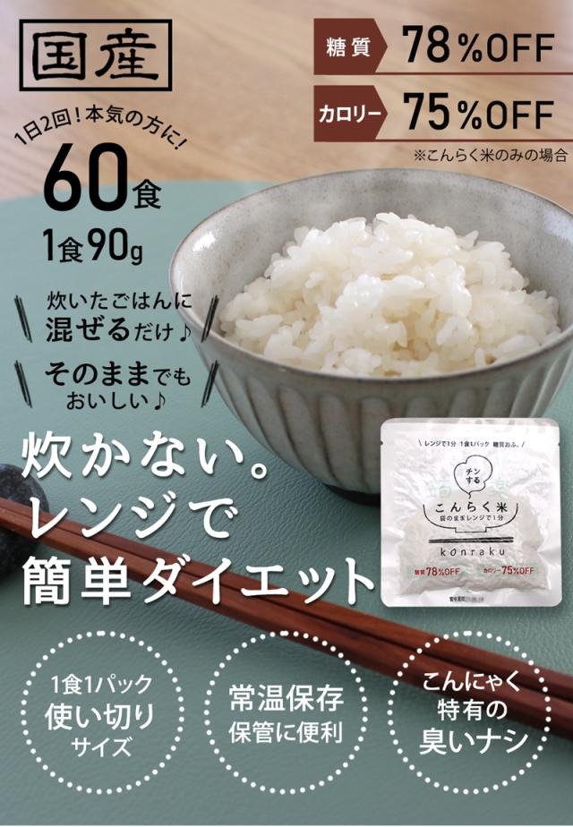 国産 【 こんらく米 60食 】 ダイエット食品 こんにゃく米 一食置き換え 置き換えダイエット ダイエット 健康 糖質制限 カロリー オフ 簡単 ごはん マンナン 低糖質 電子レンジ こんにゃく コンニャク 米 お米 ご飯 蒟蒻 イソフラボン 保存食 置き換え 送料無料 221023-60