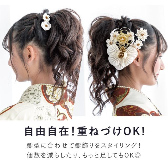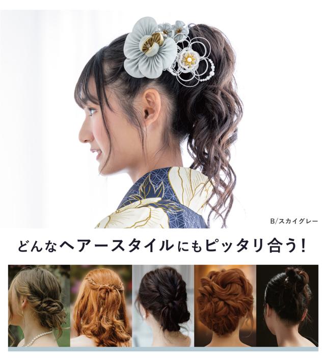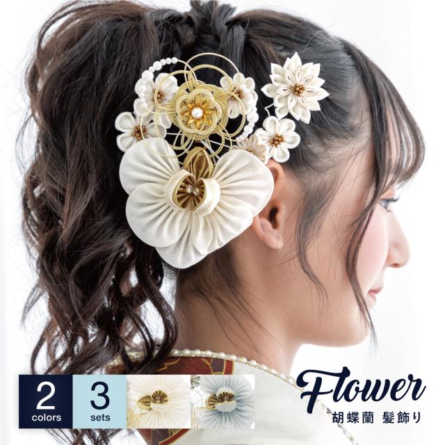 髪飾り 3点セット 成人式 卒業式 振袖 袴 和装 着物 白 ホワイト ブルー グレー 花 フラワー くすみカラー つまみ細工 胡蝶蘭 梅 水引 女性 大人 可愛い レトロモダン コーム Uピン 送料無料