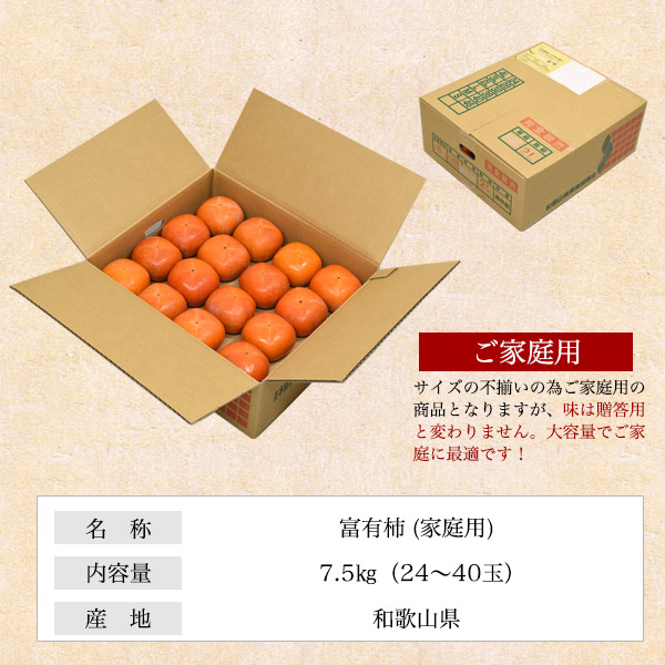 富有柿 大容量7.5kg 24〜40玉 和歌山 ご家庭用 九度山 糖度15度以上 種あり かき カキ ふゆうがき 24〜40個入り くだもの ご自宅用 国産 和歌山 甘い 果物 秋の味覚 旬の果物 B品 訳ありアウトレット 常温 サイズ不揃い 送料無料 食品ロス削減