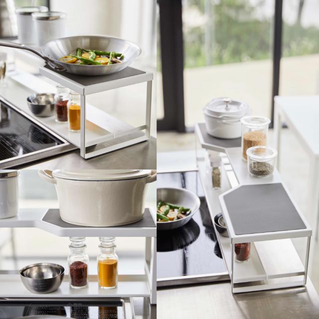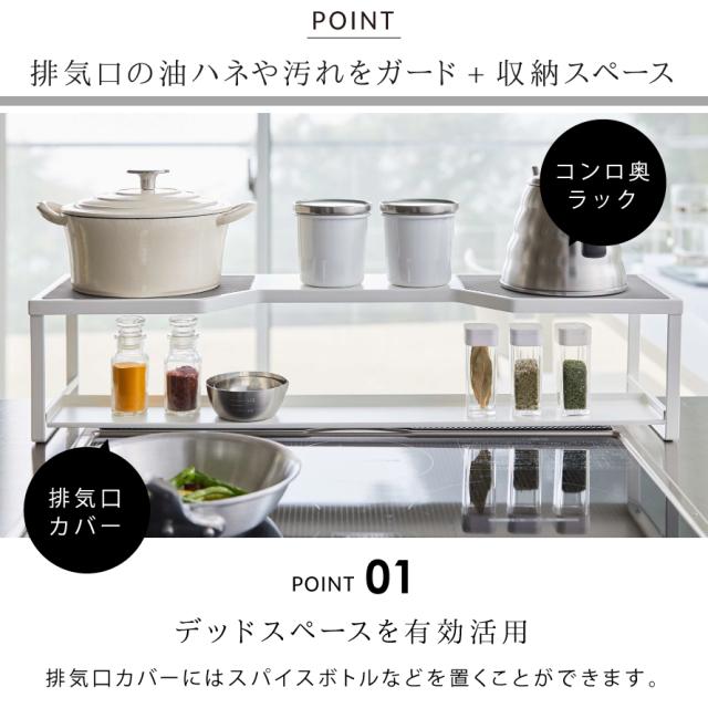 小物が置ける排気口カバーとコンロ奥ラックが一体になった、排気口カバー付きコンロ奥ラック!幅66cm以内のガス、IHコンロに対応しています。