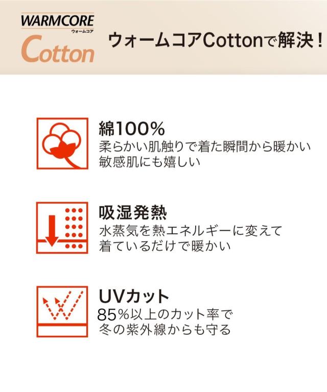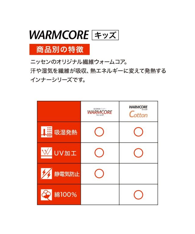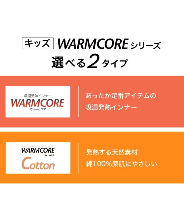 [keyword] 子供服 子ども キッズ 子供用品 幼稚園 小学生 中学生 吸湿発熱 あったか 暖か あたたか 寒さ対策 防寒 冬 綿100% コットン100% 綿素材 綿 コットン 生地 女の子 女児 ジュニア 男の子 男児 お買い得セット まとめ買い セット お得 [comment] 肌に優しい発熱する綿100% 【ウォームコアコットン】 天然素材 綿100%のあったかインナー。合繊インナーのような着た瞬間のヒヤッと感がなく、冬のお肌を優しく包み込みます。程よく厚地で見せても見えても違和感のないインナーです。 <こんなお子様におすすめ> ・インナーを着た瞬間のヒヤッと感が嫌 ・合繊のインナーが嫌 ・冬の乾燥で肌がかゆくなる 【ウォームコアコットン】は、あたたかさと肌へのやさしさを両立。 きっと毎日着たくなるここちよさです。 【特徴】 ・吸湿発熱 水分を熱に変換し、着ているだけで暖かい。 ・綿100% 柔らかい肌触りで、ふんわり優しくお肌を包み込む。 コットンは帯電しにくい素材のため、静電気が起こりにくい。 ・UVカット 冬の紫外線からも守る。 【デザイン】 ・丸首、長袖 ・程よく厚地であたたかい 【サイズ】 ・100〜170cmの全8サイズ展開 【カラー】 黒2枚 / 白2枚