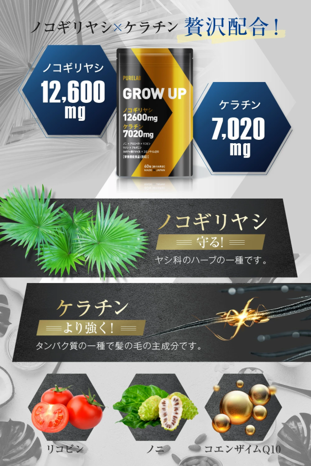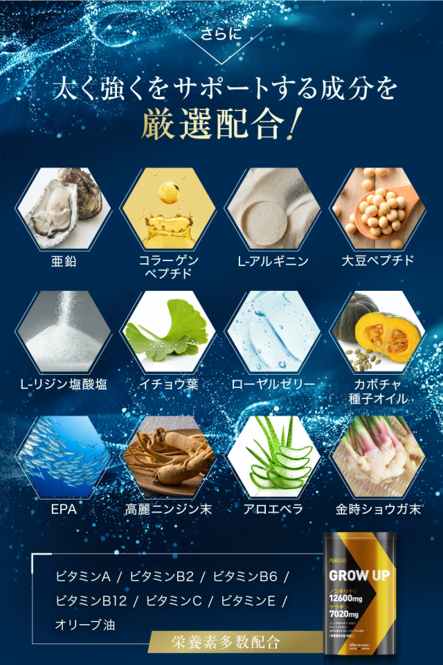 ケラチン加水分解物、ノコギリヤシオイル、ノニ粉末、グルコン酸亜鉛、リコピン、L-アルギニン、L-リジン塩酸塩、ローヤルゼリー、コエンザイムQ10、EPA含有精製魚油加工食品、ビタミンA、ビタミンE含有植物油、ビタミンC、ビタミンB2、ビタミンB6、ビタミンB12、アロエベラエキス、コラーゲンペプチド、大豆ペプチド、イチョウ葉抽出物、カボチャ種子オイル、高麗ニンジン末、金時ショウガ末、食用オリーブ油