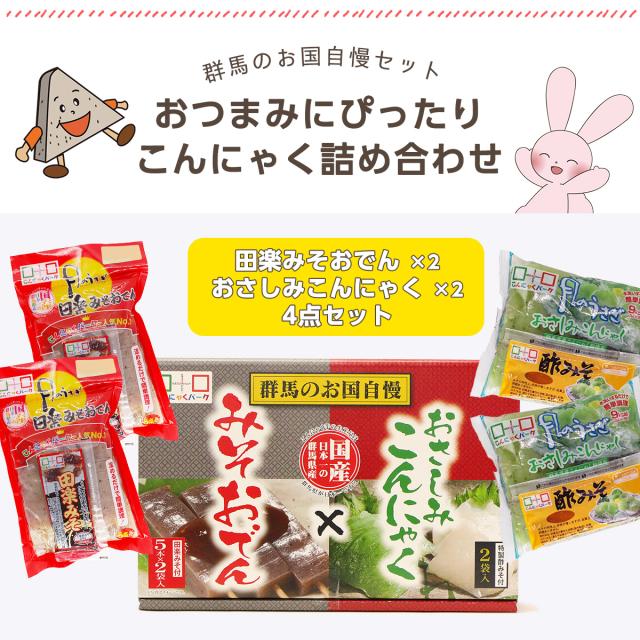 | 「みそおでん」と「おさしみこんにゃく」を詰め合わせた群馬のお国自慢セット。温めてそのまま簡単に食べられる「みそおでん(5本入)」とプリッとした食感が特徴の「おさしみこんにゃく」。ごはんのおかずにもう一品、おつまみにもぴったりです。 |