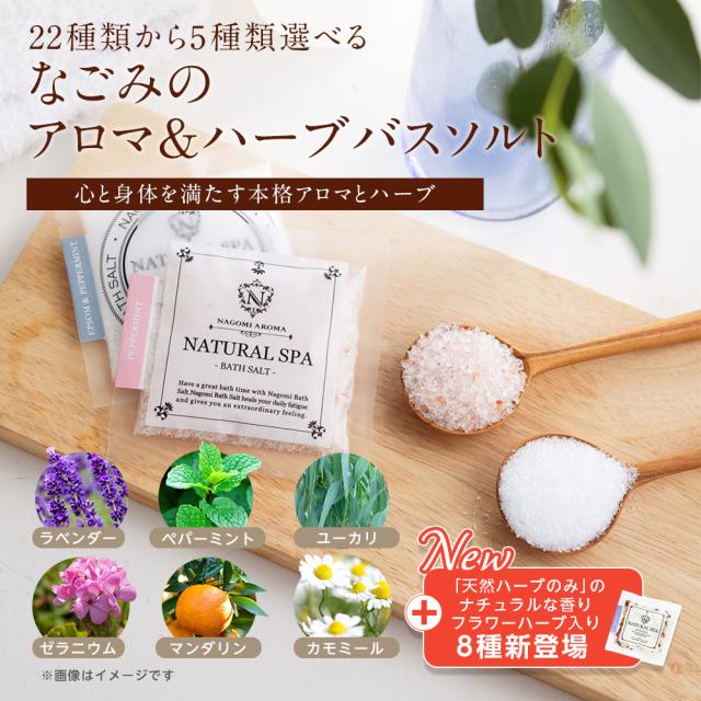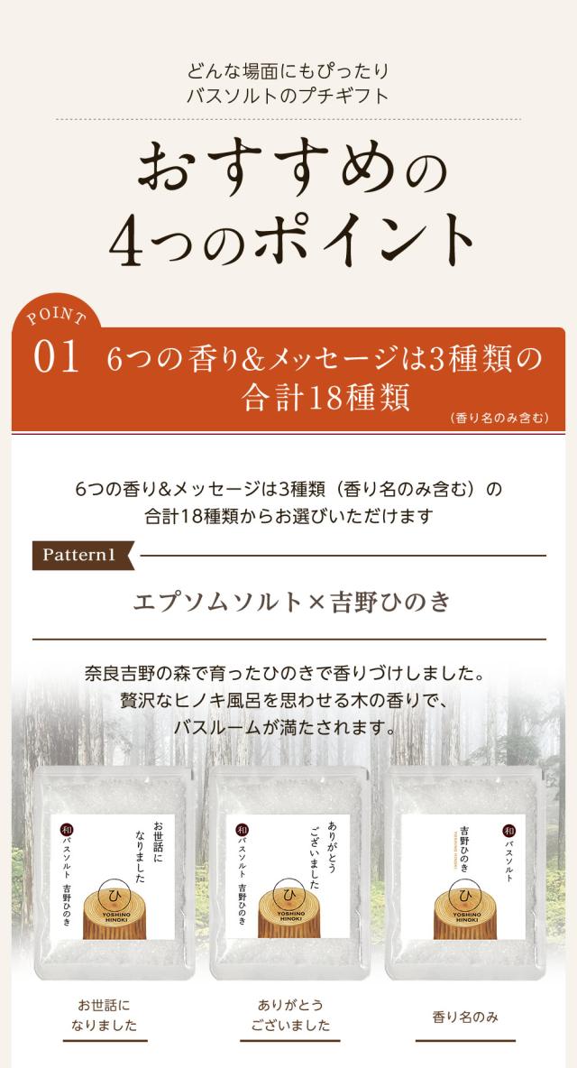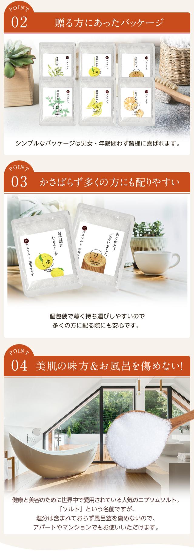 【特徴】プチギフトにおすすめの1回使い切りタイプのバスソルトです。人気のエプソムソルトに6種類の和精油で香りづけしています。