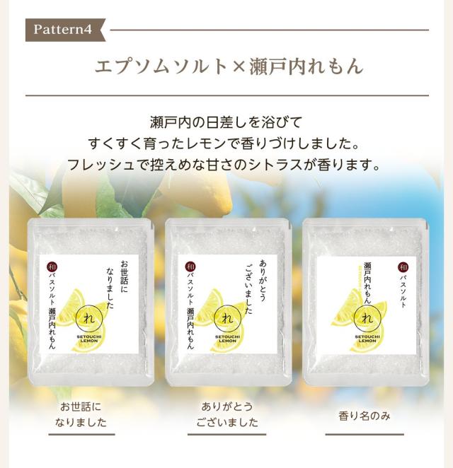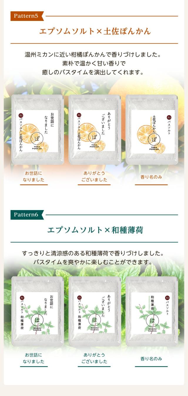 【原材料】[エプソム&吉野ひのき]硫酸Mg、ヒノキ木油、[エプソム&四万十ゆず]硫酸Mg、ユズ果皮油、[エプソム&青森ひば]硫酸Mg、アスナロ木油、[エプソム&瀬戸内れもん]硫酸Mg、レモン果皮油、[エプソム&土佐ぽんかん]硫酸Mg、マンダリンオレンジ果皮油、[エプソム&和種薄荷]硫酸Mg、ハッカ葉油