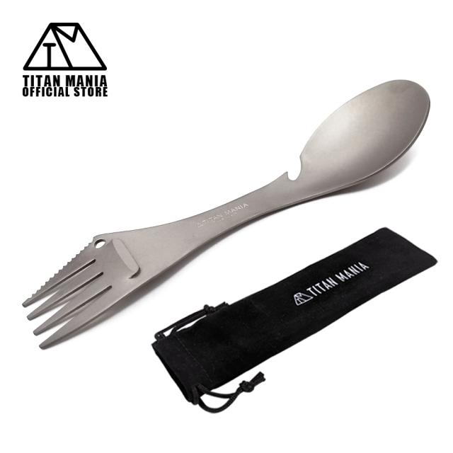 TITAN MANIA チタンマニア カトラリー チタン製 3in1 一体型 ソロキャンプ アウトドア 超軽量 頑丈 スプーン フォーク ナイフ 食器 調理器具 キャンプ用品 収納袋付き
