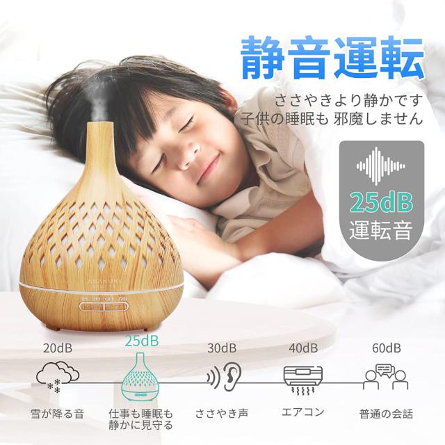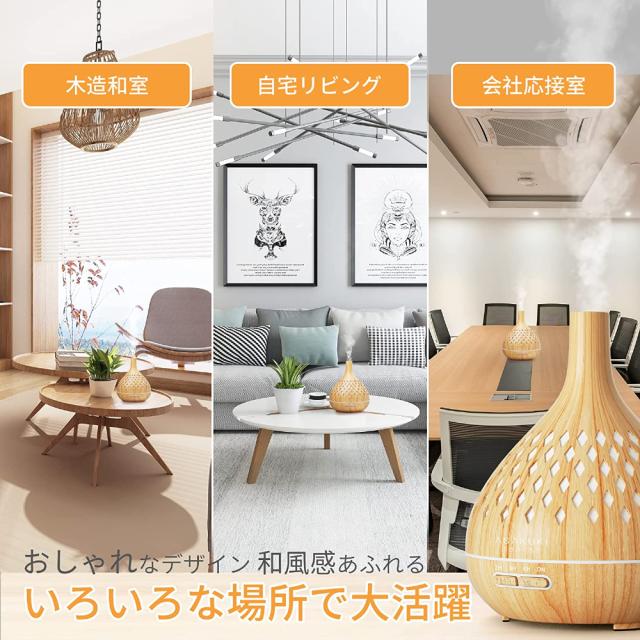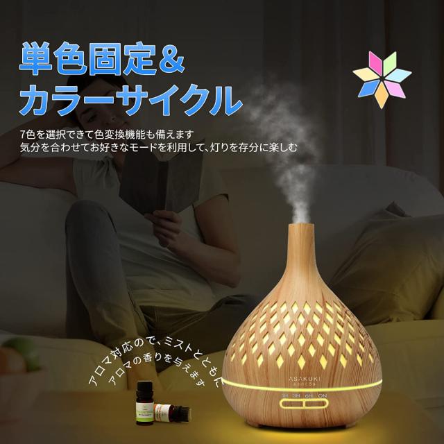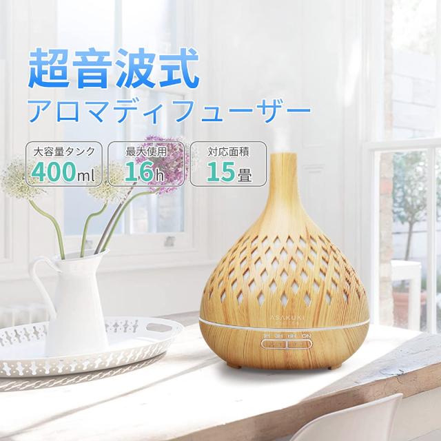 加湿器 卓上 400ml 15畳対応 アロマディフューザー 大容量 超音波式 おしゃれ 木目調 アロマ対応 タイマー LEDライト7色 空焚き防止 コンパクト お手入れ簡単 LEDナイトライト 静音設計 寝室/リビング/会社/学校用 オフィス