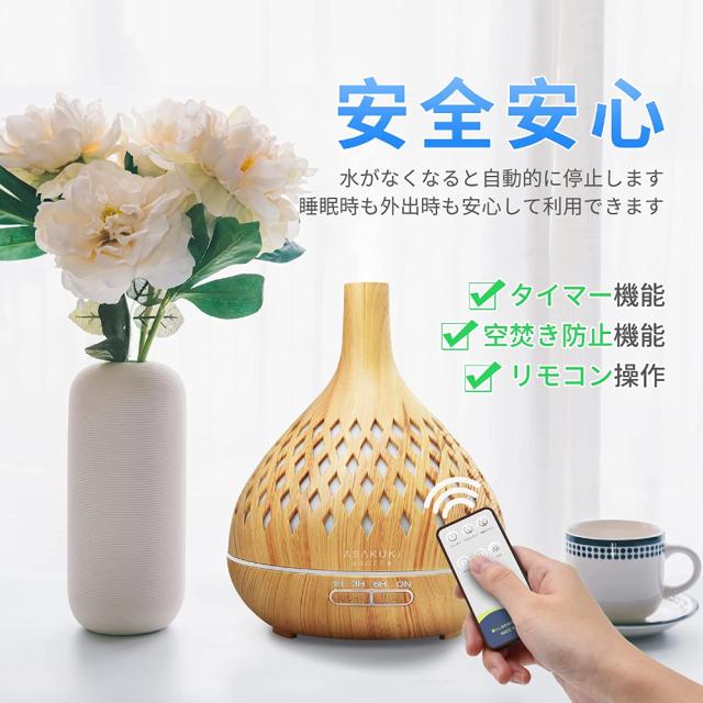【操作便利】本体ボタンで直接使用できるし、リモコンでリモートコントロールできるし、使いやすいです。それにアロマディフューザーの使用に役立つ日本語説明書も含まれています。夜にエッセンシャルオイルを入れて、LEDライトをつけて、癒しの雰囲気を簡単に作られます。