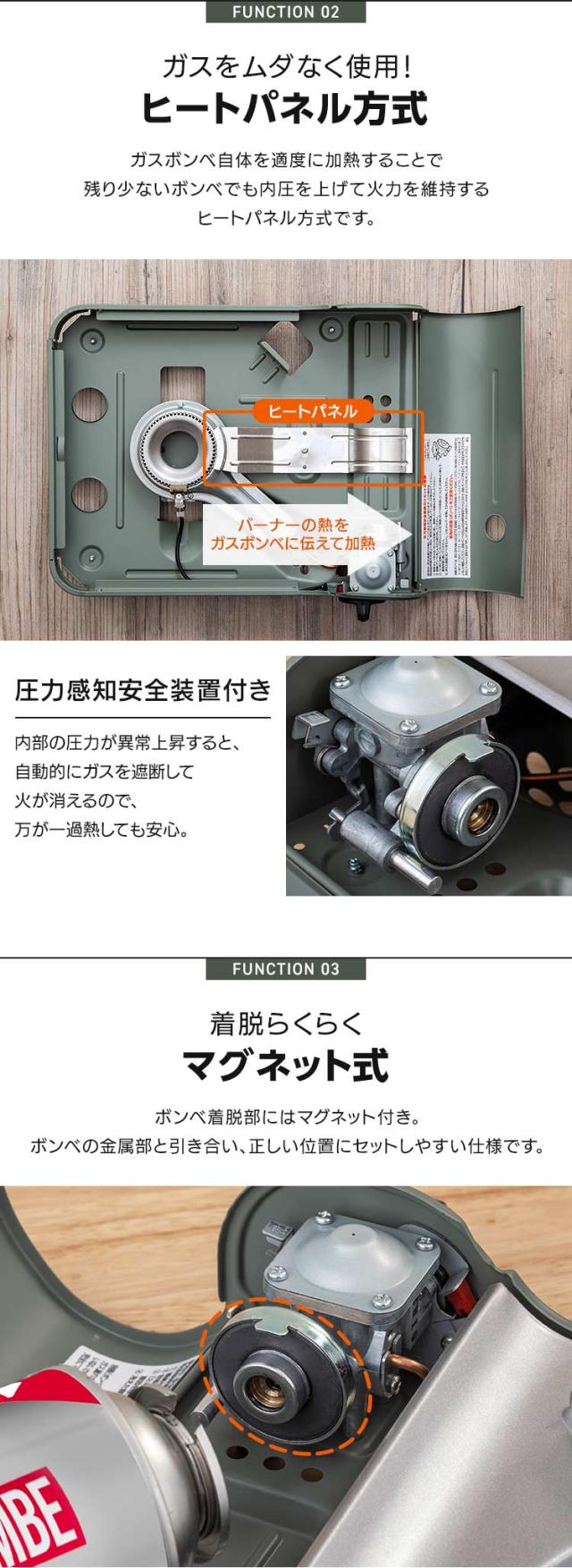 - 火力も強く満足です。カセットガスの着脱も簡単でした。純正品以外のガスは使えませんでしたが問題なし。カセットガスのところの蓋を開けないと五徳が取れないこともなく、お手入れも簡単で満足です。