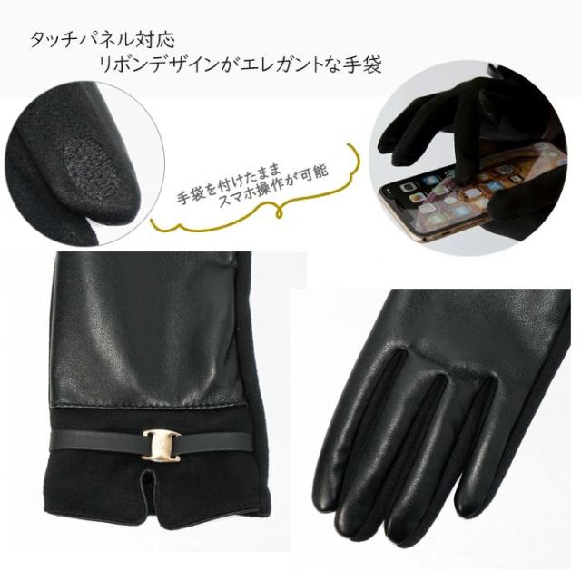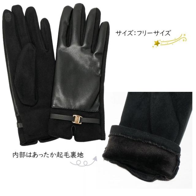 なしなやかなエコレザーを使用した柔らかな手袋。 内側は起毛しており、指先までしっかり暖か。 手のひら側は女性らしく上品なスウェード風デザイン、 手の甲側にはゴールドカラーのバックルをあしらいさりげないアクセントに。 人差し指にはタッチパネル操作可能な刺繍入りです。