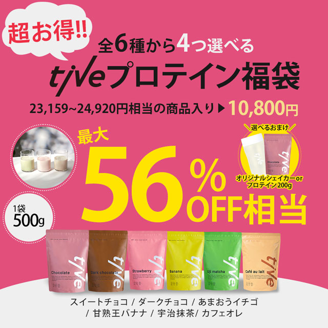 【半額以下】プロテイン福袋 Wプロテイン tive(ティブ)選べる4個入り(500g×4) シェイカーかお試し200gおまけ選べる