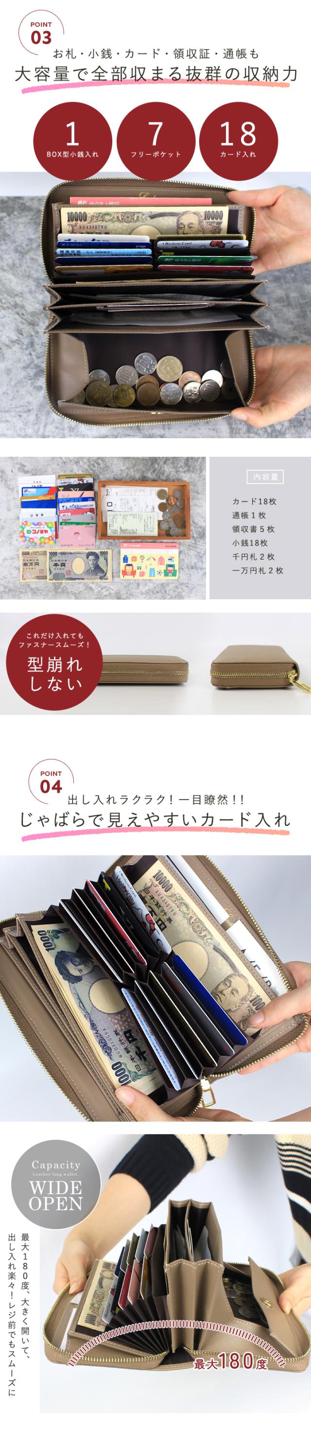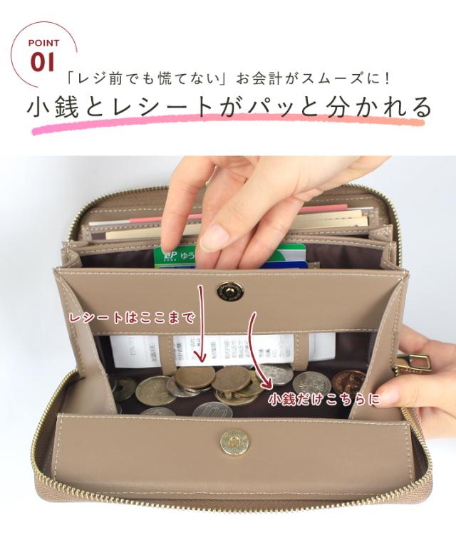 お札、小銭、カード、レシート、領収証、通帳も全部まとめて収まる大容量。