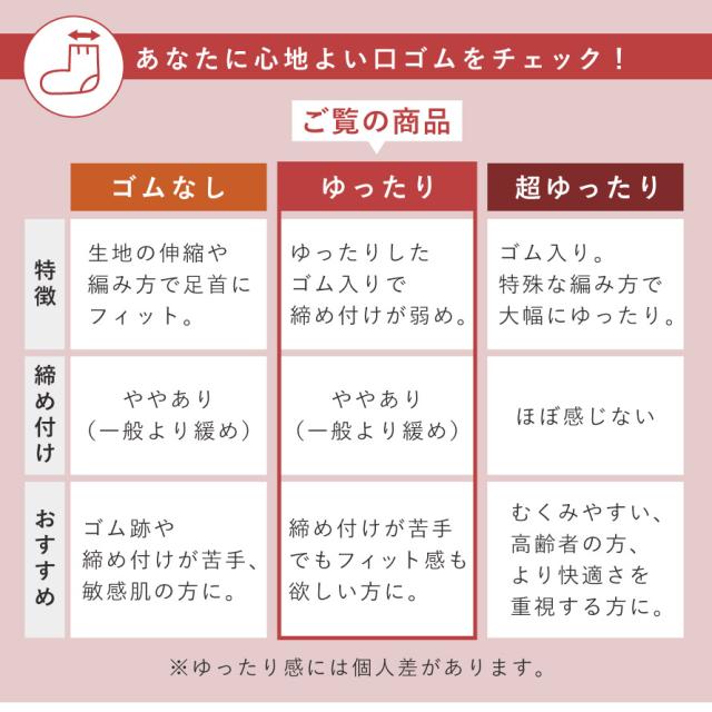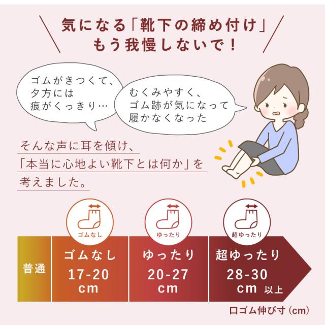 履き口(口ゴム)は24.5cm伸びるゆったり仕様。足首を締めつけないので、むくみが気になる方やシニアの方にも快適。約23cmの丈長タイプで、冷えやすい足首までしっかりカバーします。
