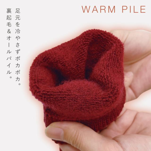寒い地域にお住まいの方にもご納得いただける、極上のあたたかさを備えた5本指靴下。裏起毛仕立てに加え、内側全体がパイル編み(タオルのようなループ状の編地)で作られた特別仕様です。足全体をふんわり包み込み、履いた瞬間からぬくもりを実感できる極厚の秋冬用ソックス。