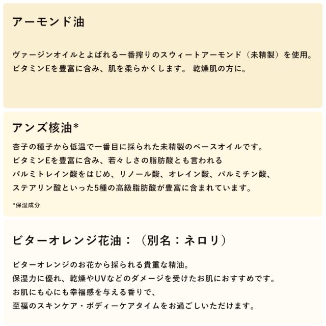ネロリの華やかな香りが包み込む。 ヴァージノル*とは「ヴァージナル オイル(膣まわりオイル)」の造語です。女性のデリケートゾーンは肌を潤いで満たすことですこやかさを保つことに繋がります。今回のデリケートゾーンケア用オイルは、乾燥やくすみ*3、硬くなった肌にふっくらハリのある潤いを与えつつ、女性らしいすこやかさをサポートします。 *ヴァージノルは株式会社リッチフィールド社の登録商標です。 *1医師や助産師に相談したうえでご使用ください。 *2会陰周辺の肌ケアのこと。 *3乾燥による *4保湿成分 | 特徴成分