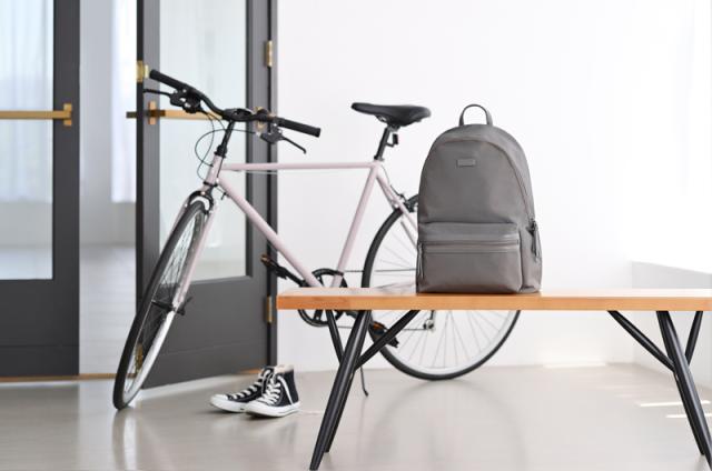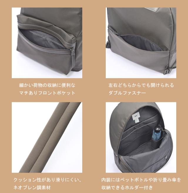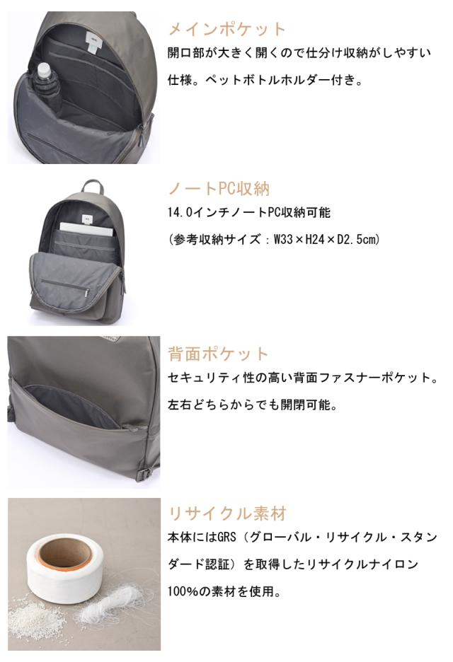 カジュアルなデイパック型のデザインで、スニーカー通勤の方にもおすすめのオン・オフ兼用リュック。肩ベルト裏側のクッションやPC収納といった機能性だけでなく、高まる環境意識にも対応する為、本体生地にリサイクル素材を使用しています。