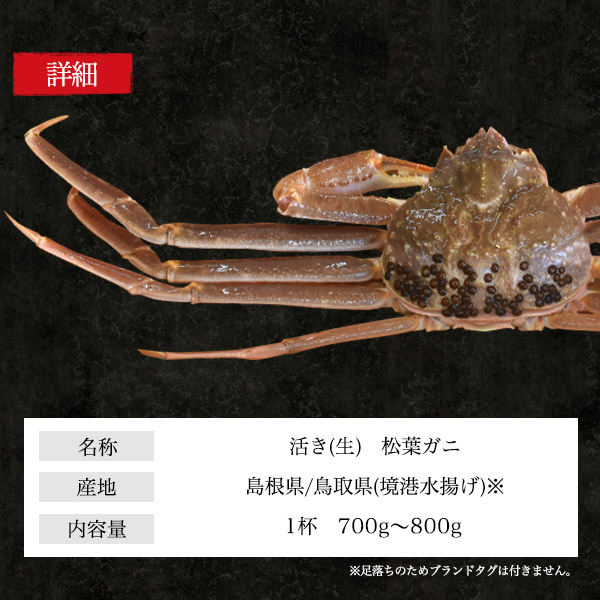 新物 訳あり 松葉ガニ 姿 約700〜800g 1杯 1本足落ち 活き 松葉カニ 松葉がに 境港直送 殻付き 活蟹 ズワイガニ 1匹 まつばがに 送料無料 蟹 国産 新鮮 カニ かに 鍋 活けカニ 活けガニ 焼きガニ 冬の味覚 海の幸 冷蔵 クール 宴会 宅飲み 刺身OK 刺身可 まるごと 1人前 爪 足