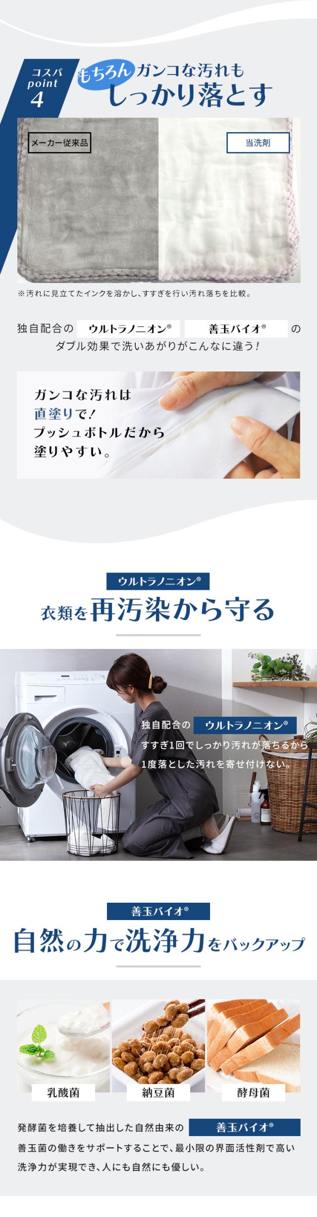 柔軟成分の配合により柔軟剤を併用しなくてもタオルなどの綿製品の肌触りが良く、吸水性を損なわない洗濯。