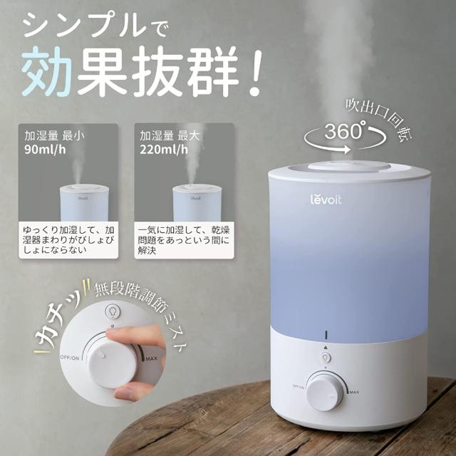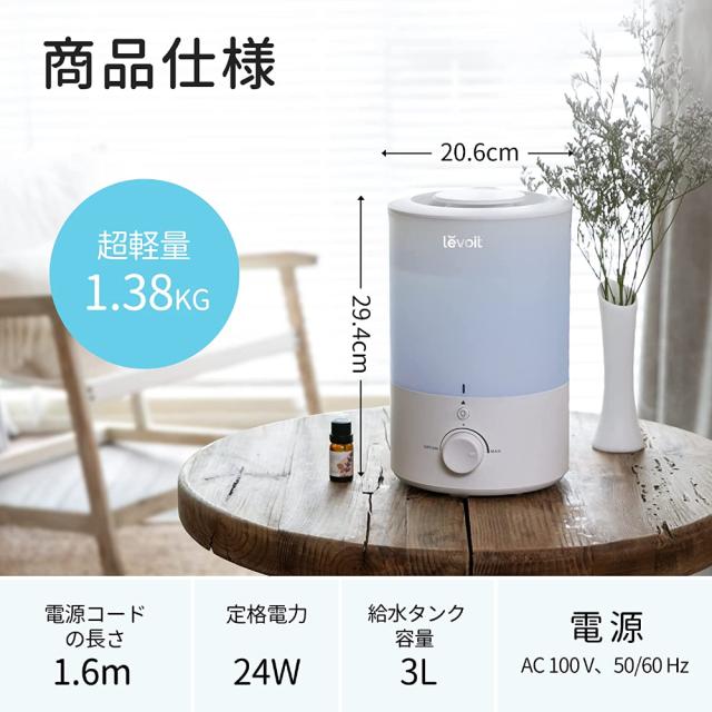 【コスパ高・25H連続運転・無段階ミスト調節】1コスパ重視のあなたにピッタリです。性能とコストのバランスが取れた、コスパに優れた超音波式加湿器です。 2最大約25時間の連続運転!3L大容量サイズで、1回の給水で朝までお使いいただけます。 3加湿力と静音性を兼ね備えており、ミスト量は90ml/hから最大220ml/hまで ゆっくり加湿して、周りがびしょびしょにならない。一気に加湿して、乾燥問題をあっという間に解決。家族の健康を考えて子供部屋や寝室にピッタリ!です。4ミストの噴霧量でご自由に調節できますので、寝室、リビング、オフィスに向けて、ハイパワー加湿でお部屋全体に潤いを届けます。また、乾燥肌、鼻や喉の乾き、ドライアイなどのお困りの方も安心しておまかせください。