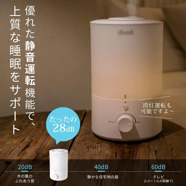 【超静音・上部給水・アロマ対応・ナイトライト】 28dBの超静音設計で昼でも夜でもどんな時でも邪魔にならない。 2上部給水式なので蓋を開けるだけで楽に注水できます。また、給水タンクを取り外し給水することもできます。 3水溶性アロマオイル対応なのでお好みの香りで加湿と香りの両方を楽しめます。 4アロマを楽しむ際には、水溶性アロマオイルを10〜15滴、底部に入れてください。 ほのかなアロマの香りからパワーチャージをしながらゆっくりと過ごしましょう。※水溶性アロマオイルは別売です。 5ナイトライトを搭載したコンパクトな構造で、間接照明として夜のおうち時間をより楽しみになります。