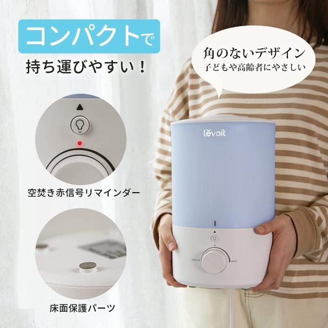 【コンパクト・空焚き防止・省エネ】 1丸みのある柔らかなラインが特徴的で、ボタン一つのシンプルなデザインがおしゃれ。インテリアとしてもおすすめします! 2コンパクトで軽いので持ち運びも簡単にできるのも大きなメリットです。お年寄り・子供がいる家庭でも安全に使えます。 3運転中にタンクを外し、またはタンク内の水がなくなるとライトが赤くなり、加湿器は自動的に停止しますので、お出かけ中、就寝時などの長時間の使用でも空焚きしてしまう心配なく安心して使えます。 4消費電力の少ない超音波式でパワフル加湿と省エネを実現。
