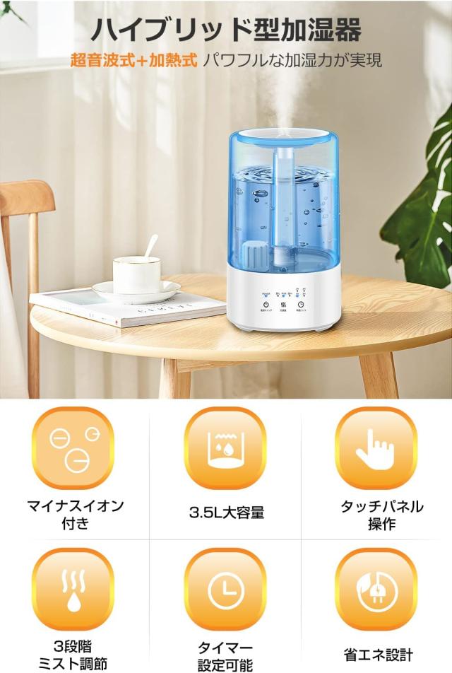 加湿器 最大18畳対応 加湿機 アロマ 次亜塩素酸水対応 静音 空焚き防止 マイナスイオン/高温抗菌 乾燥/花粉対策 PSE認証済 大容量 3.5L 超音波加湿器 加熱式 ハイブリッド式加湿器 卓上加湿器 3段階加湿量調節 LEDタッチパネル タイマー機能 寝室/リビング/会社/学校用