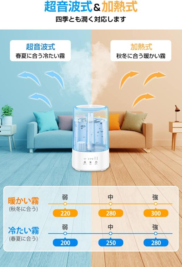 【ハイブリッド式加湿器&次亜塩素酸水対応】加湿器 卓上 超音波振動で水を気化してミストを放出する超音波式X加湿効率を高めるヒーターを組み合わせたハイブリッド加湿器です。超音波式とヒーターを組み合わせる事でパワフルな加湿力と清潔なミストが実現しながら、タンク内の水が熱くならず、万が一転倒しても安心です。超音波式の静音性を活かした設計で静かで加湿器できます。ヒーターのON/OFFができ、消費電力の少ない超音波式のみへの切替も可能で、電気代を抑え、経済的です。50ppm以下の次亜塩素酸水を入れて使用できます。