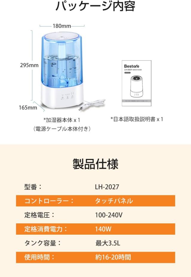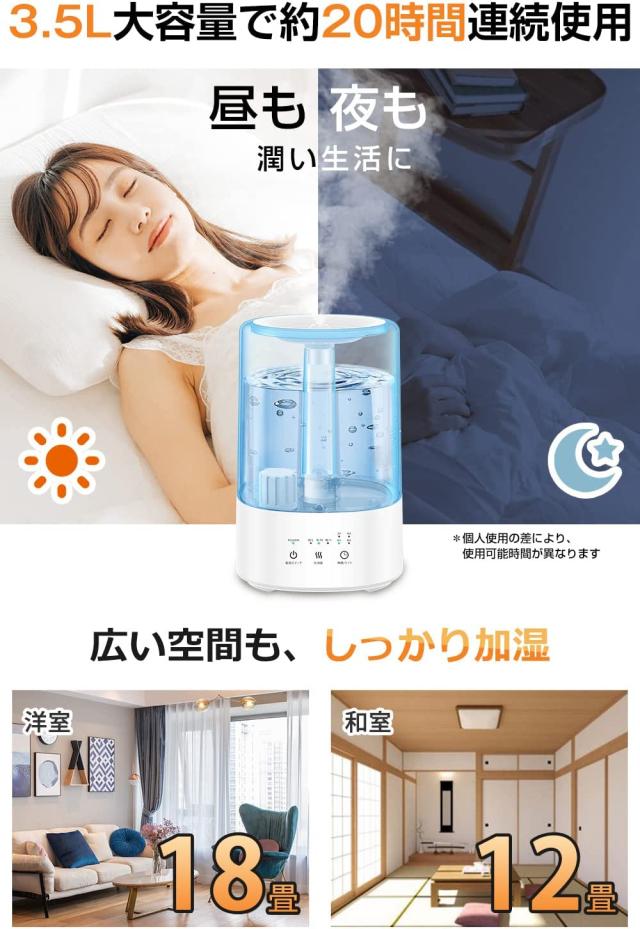 【3.5L大容量&最大18畳まで対応】 加湿器 大容量のタンクは約3.5リトル入る大きいサイズとなり、最大約20時間の連続運転を実現(ヒーターオフの場合)!給水の回数が少なくて、一回の給水で一日中しっかり加湿できます。最大加湿量は約300ml/hとハイパワーで、18畳の広い空間でもしっかり加湿できます。3段階の加湿量調節とヒーター機能の組み合わせで、6段階の加湿量調節が可能になります。『安心の空焚き防止機能』水が少なくなった時、本体の表示パネルに給水マークが表示され、自動電源オフになります。