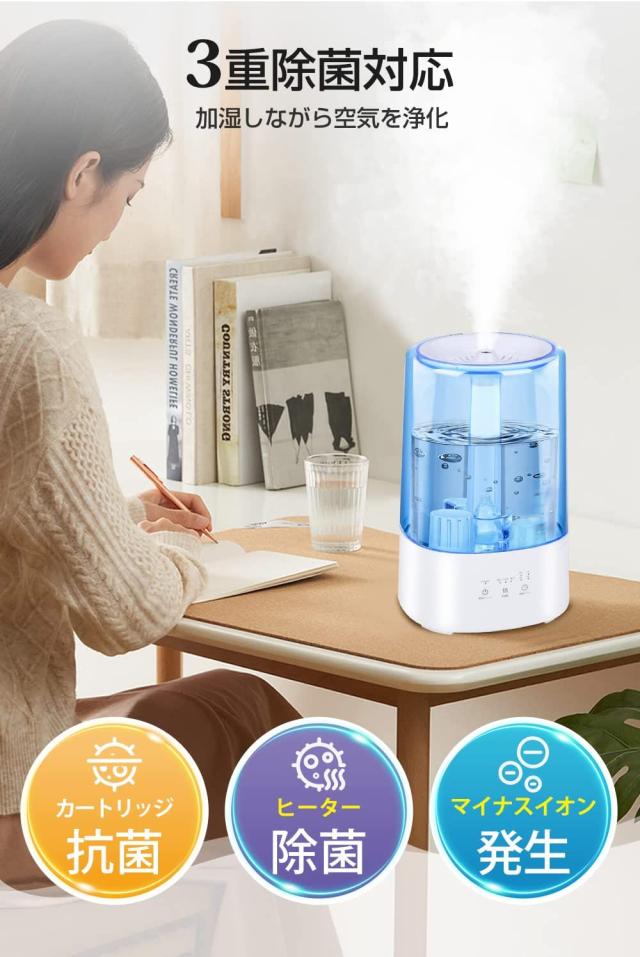 【マイナスイオン機能&タイマー機能】マイナスイオン機能搭載、加湿しながら、空気を浄化し、キレイに加湿。さらに、ヒーターをオンにしたら、水を加熱し、雑菌の繁殖を抑えながら常に清潔なミストで効率よく加湿します。 タイマー機能付き、「タイマー」ボタンで、自動で運転を停止するタイマーを設定できます。2-8時間まで設定可能です。消し忘れを防いで、ムダなく電気代を節約します。