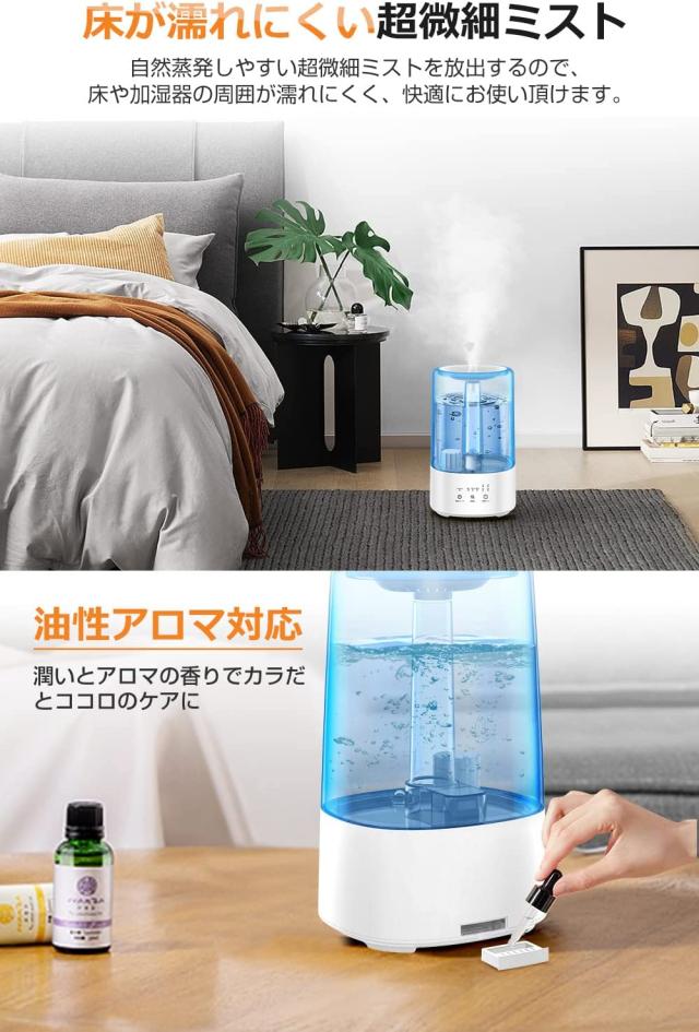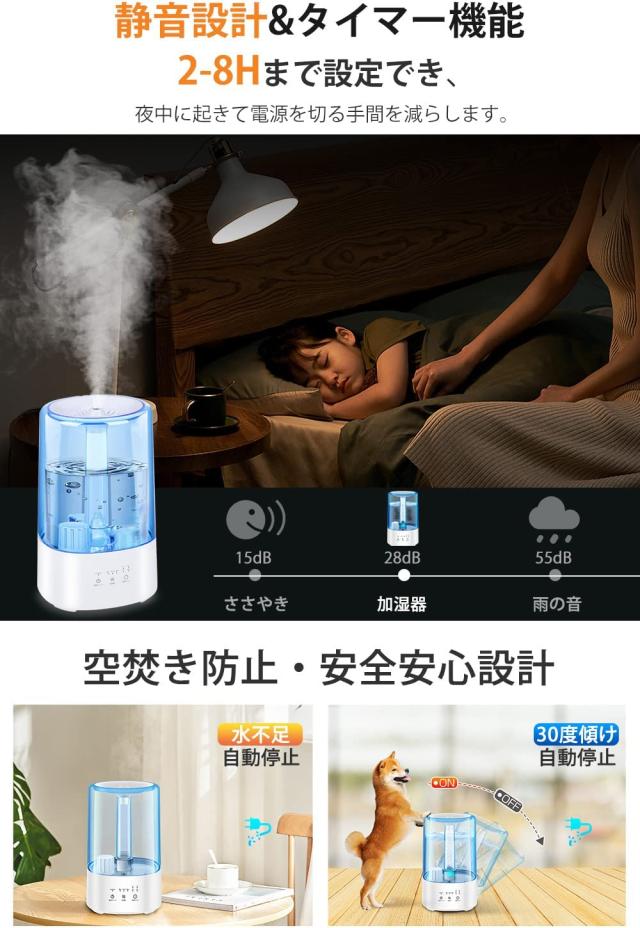 【アロマ対応&超静音】 加湿器 はアロマケースが付いており、お好みのエッセンシャルオイルを入れ、室内をいい香りで満たすことができ、仕事や家事の疲れを軽減し、心の疲れも癒す。加湿器の動作音が28dBより小さく抑えられていて、仕事中や睡眠でも静かに穏やかに加湿します。生活や仕事に妨げることがありません。