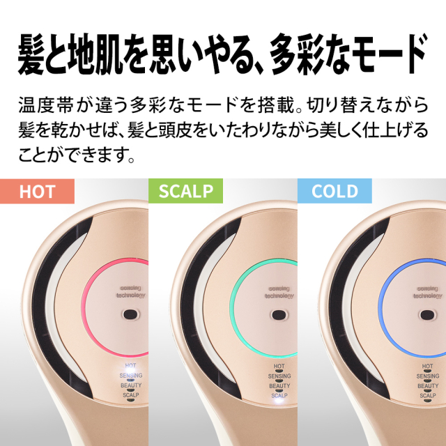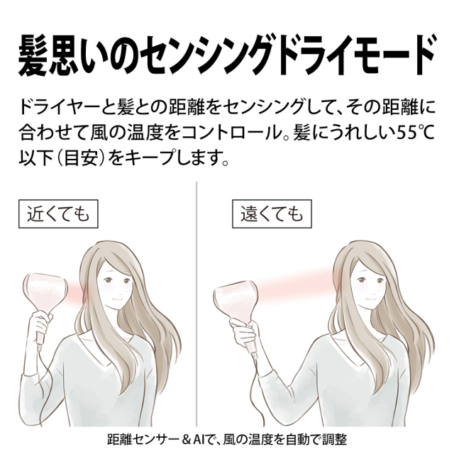 センシングドライモードでは、髪に与える熱ダメージや過乾燥を抑えるために、距離センサーとAIで風の温度を自動で調整。どの距離でも髪の表面温度を55℃以下にキープするように設計されています。ジェントルモードでは、風量を抑えて風の温度を低めにし、ドライヤーと髪が近づきすぎると冷風に切り替わる仕様。大きな送風音に敏感なお子様にも使いやすく、スタイリングの仕上げにもおすすめです。