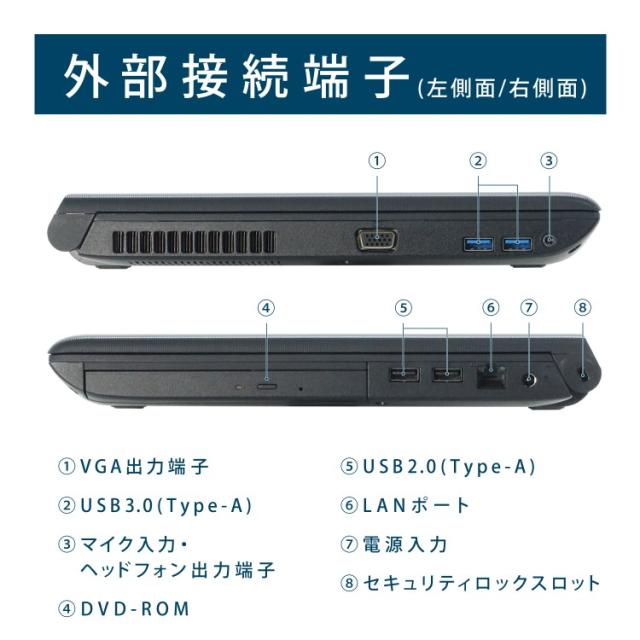 | USB3.0×2 USB2.0×2 SDカードスロット VGA 有線LAN ※機種により多少の違いがございます |