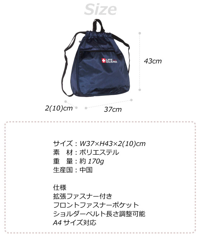 ![]() ![]() ![]() ![]() ・LIFE GUARD ライフガード 拡張マチ付きのナップサック。 シンプルなデザインは長く使え、男子女子どちらもお使いいただけます。 デイリーや遠足に、旅行にもさまざまなシーンで幅広く活躍します。 折りたたみも可能なので、修学旅行・林間学校などの学校行事のサブバッグとして、ランドセルの上からも背負えるのでも使えるナップザック。