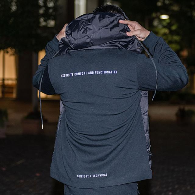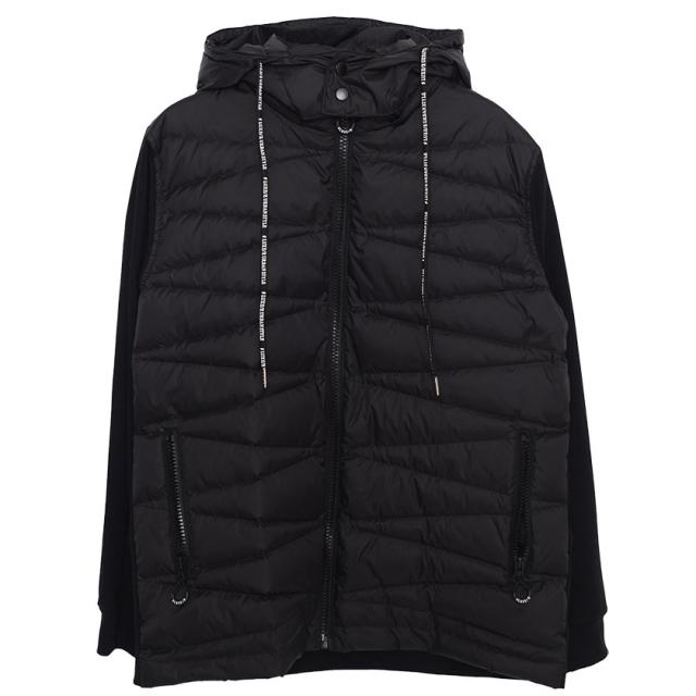 フロント部分と腕部分の素材を変えた異素材ミックスの切替ダウンジャケット。