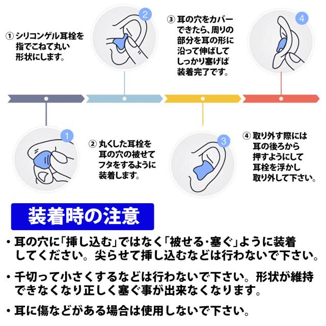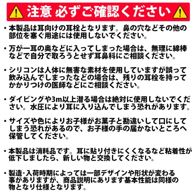 ・シリコンは人体に無害な素材を使用していますが誤って飲み込んでしまったなどの場合は、残りの耳栓を持ってかかりつけの医師などにご相談ください。