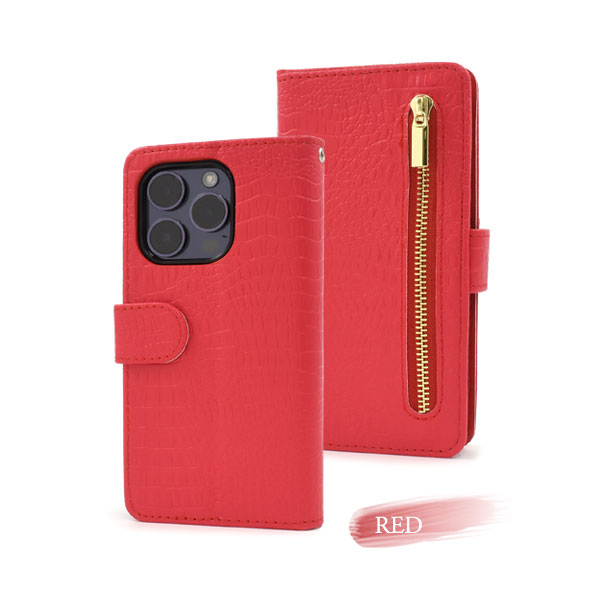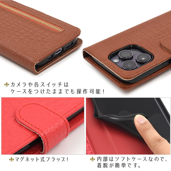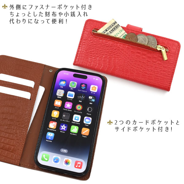 | 衝撃やキズなどからスマートフォンを守ります。 また、内部はソフトケースなので着脱が簡単です。 背面を折り返すとスタンドとして使用できるので、動画視聴に便利です。 横開きタイプなので、手帳のように使うことができます。 落下防止に最適なストラップホール付きです。 外側にファスナーポケットが付いているので、ちょっとした財布や小銭入れ代わりになって便利! また、内側に2つのカードポケットとサイドポケットが付いています。 高級感溢れるクロコダイルレザーデザイン。 ビジネスやカジュアルなど様々なシーンで活躍します。 | ||||||||||||||