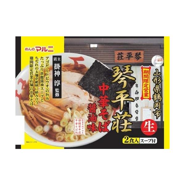 山形県鶴岡市の日本海に面した期間限定営業のラーメン店です。海水浴客で賑わう旅館ですが、秋から春にかけては閑散期となり、その対策として中華そば処を開店しました。地元のお年寄りに愛される中華そばを目指し努力した結果、今では連日行列の出切る人気店となりました。日本随一のラーメン激戦地山形県の銘店であり、期間限定営業の「中華そば」をご家庭でもぜひ、ご賞味ください。原材料・成分山形琴平荘監修中華そば醤油味