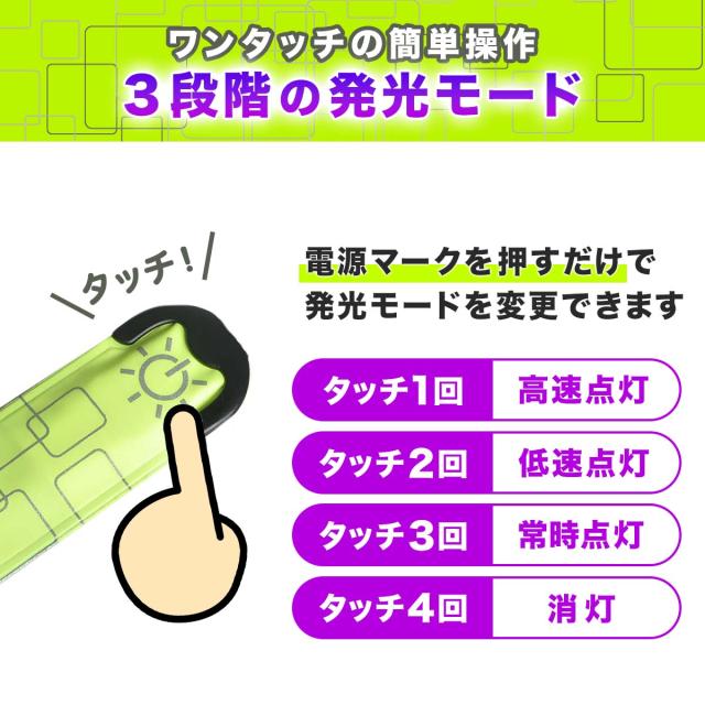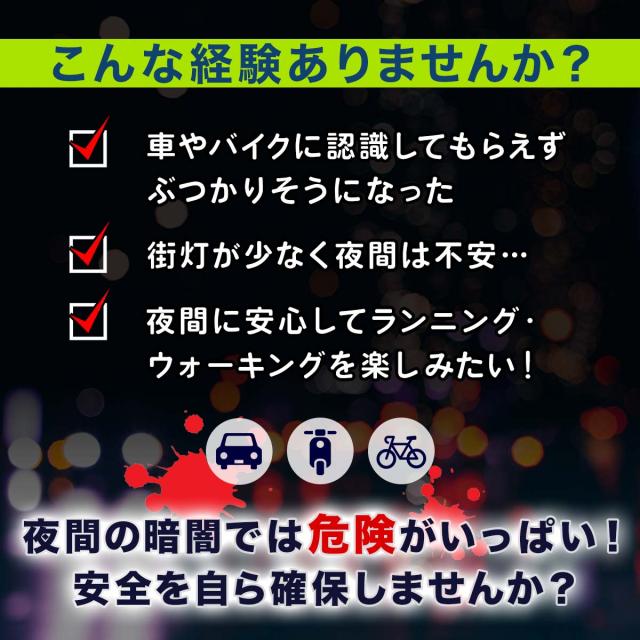- 暗くなってからの時間の ウオーキング時に使用しています。 常時点灯での使用が多いですが、 非常に明るく目立ち、歩道の無い 道路では安心感があります。 後は、バッテリーの耐久性が良ければ 最高に良いと思...