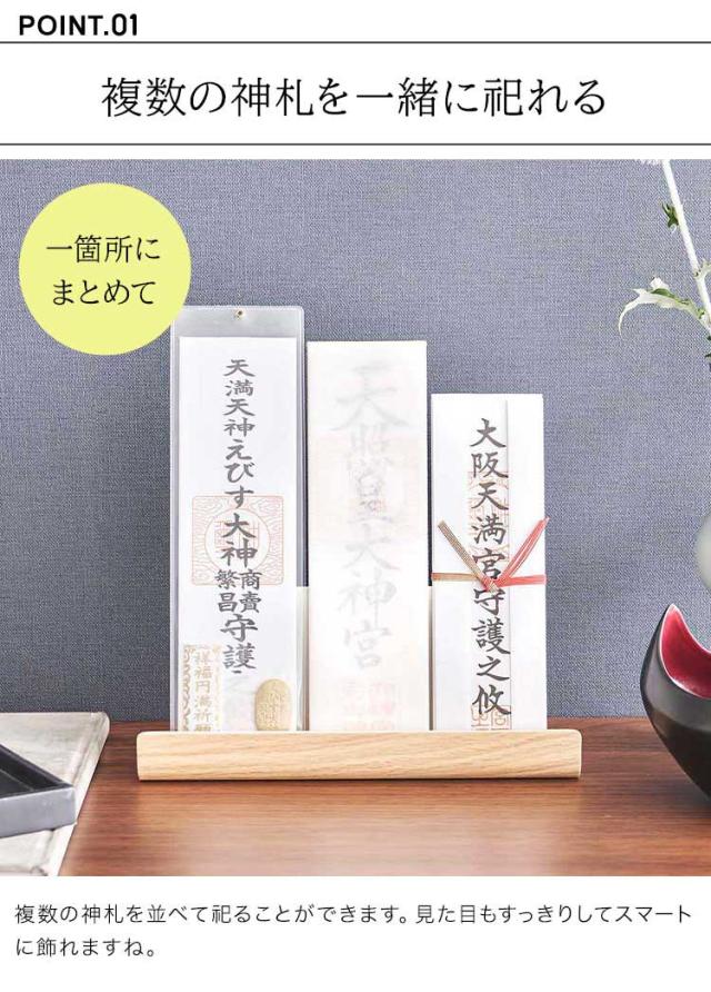 神棚がなくてご家庭で置き場に困っていませんか。そんなご家庭でも神札を定位置に!RINの神札を祀ることができる置き型のスタンド。複数の神札を祀ることができるワイドタイプです。 シンプルな木目のモダンなデザインなのでインテリアにも溶け込み、すっきり飾ることができます。