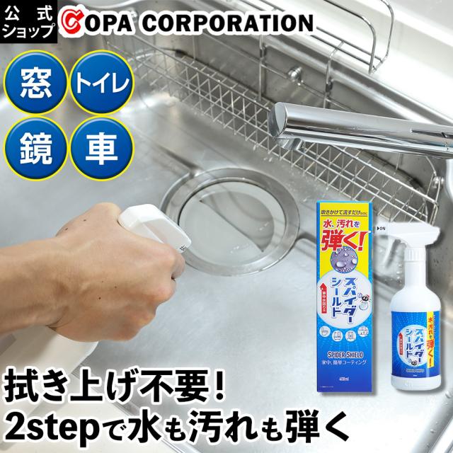 スパイダーシールド 400ml |コーティング剤 コーティング 撥水 撥水剤 水回り 水まわり 車 車用 硝子 ガラス 窓ガラス 人気 おすすめ 長持ち 弾く 台所 キッチン シンク 洗面台 お風呂 浴室 浴槽トイレ 自転車 拭き上げ 予防 業務用 皮膜 汚れ 掃除 大掃除
