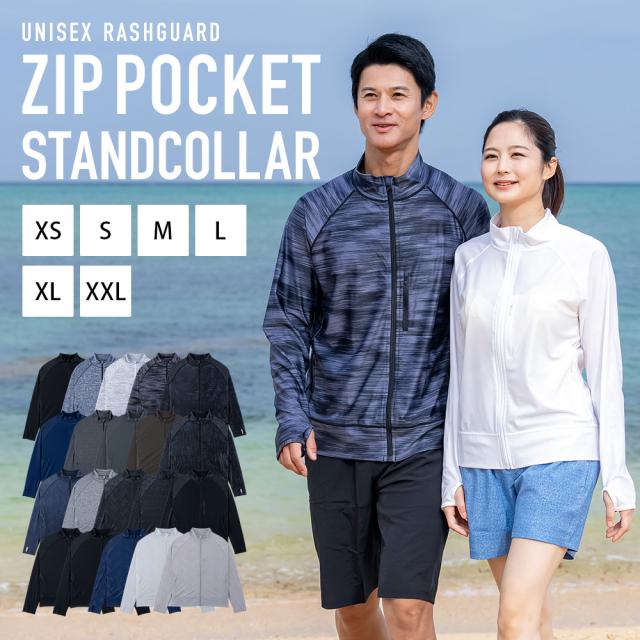 ラッシュガード ユニセックス ジップポケット付きスタンドカラー 水着用 フードなし 長袖 体型カバー メンズ レデイース 日焼け対策